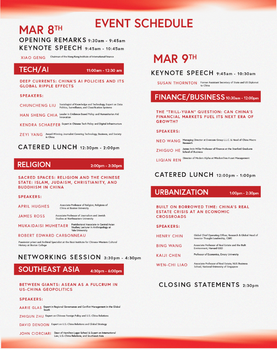 Listen to Keynote Speaker Xiao Geng, Chairman of the Hong Kong Institute of International Finance, as he discusses geopolitical tensions with China, its macroeconomic policy, China’s global ambitions, economic trajectory, advice regarding students interested in beginning a career in finance or policy, and more. There will be 20 minutes at the end for Q&A, so come prepared with questions!